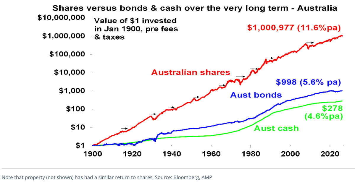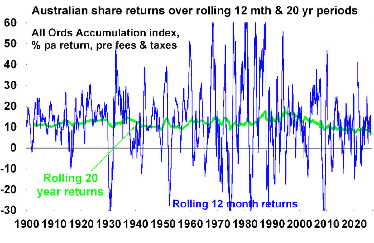 The trouble is that shares can have lots of setbacks, eg, see the arrows on the previous chart. Even annual returns are highly volatile, but longer-term returns tend to be solid and relatively smooth. Since 1900, for Australian shares roughly two years out of ten have had negative returns but there are no negative returns over rolling 20-year periods.