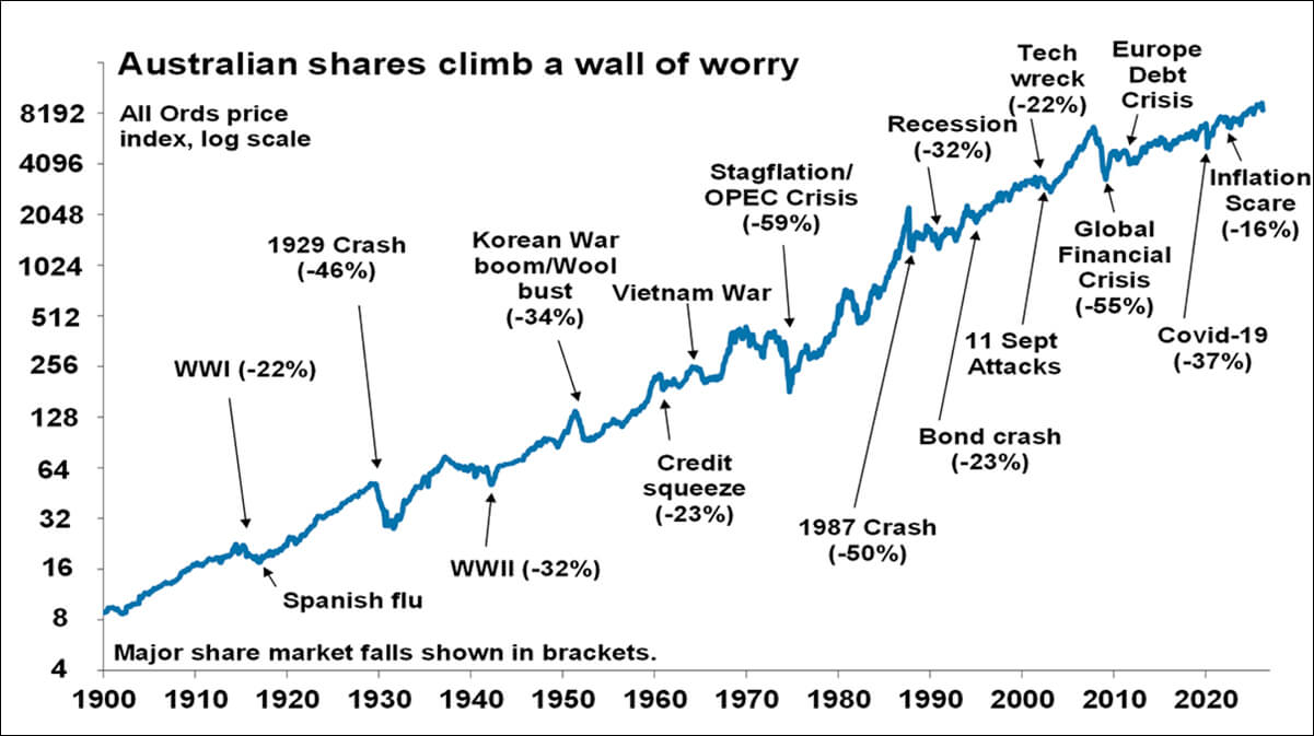 Our base case is that the War and oil shock will be relatively short as Iran will not be able to keep the Strait closed indefinitely and Trump will look for an off ramp as political pressure builds ahead of the midterms. But it could still go on for weeks yet and so could still see oil prices rise more in the interim say to $US150. We continue to see the risk of a 15% or so correction in shares this year but the size of the threat means there is a high risk it may be deeper. Trying to work out how all this plays out is not easy. But looking at shares around major geopolitical events, the typical playout is for a sharp fall of around 8% but then a recovery over the next 12 months of around 14%. Of course, there are wide ranges around this. Given the uncertainty now is a critical time to stick to basic principles of investing. So, this note revisits 5 key charts investors should keep in mind.